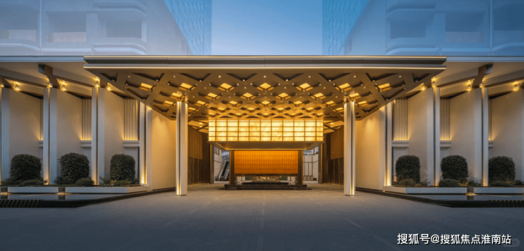 社区主入口以伦敦梅费尔瑰丽酒店为设计原型,打造了气势恢宏的酒店式门仪,200米宽的酒店式门仪,近7米高檐口,16根柱廊排成序列;点睛之笔「明瓦灯笼」,近10米宽、6米高的巨型光影装置,金色雨棚与玉石纹理透光材质巧妙衔接,下方是粼粼水景,光影流转间,直接点亮归家的仪式感。