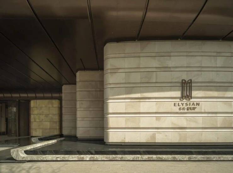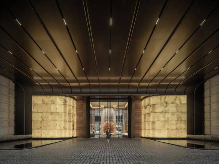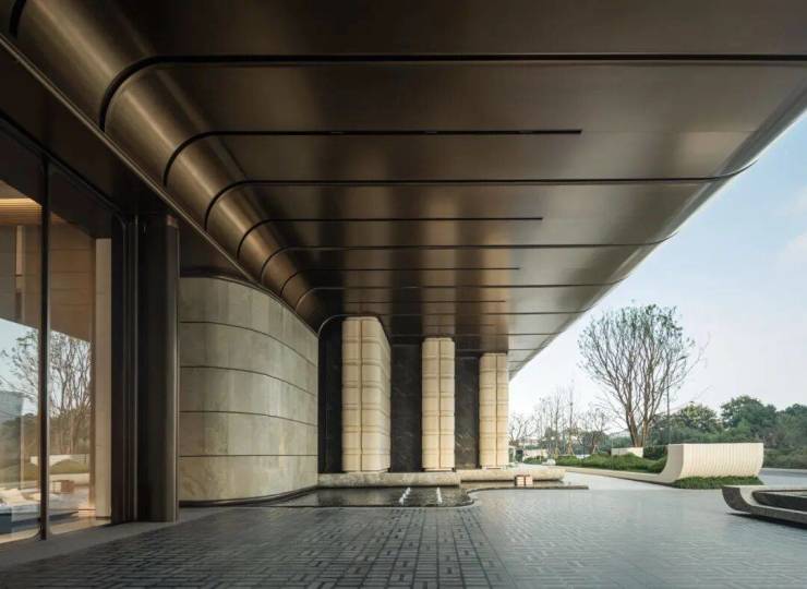 在城市与社区的接驳地带,我们希望以一道“会呼吸的烟火幕墙”重新定义了上盖型物业的界面。主入口以杭州博物馆镇馆之宝“玉琮”为设计原型,将其转译为序列化的柱式与石台。