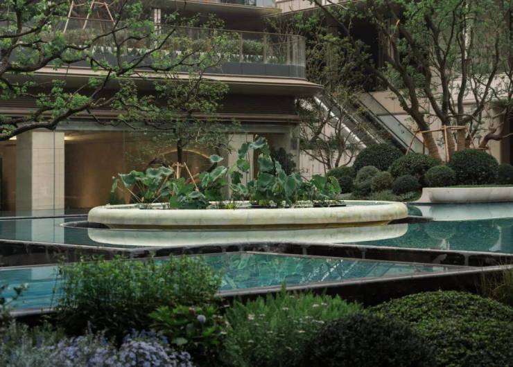庭院景观以西湖荷花为核心设计元素之一,水桥的形态则借鉴并转译西溪湿地的自然肌理,使整体空间在文化意象与自然特征之间建立关联。