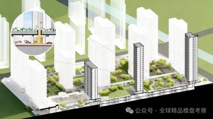 为彻底消融城市与社区的界限,项目以“超级底盘”重构社区基座。通过抬高地库、整合车站与商业配套,将地下空间转化为多功能垂直枢纽。