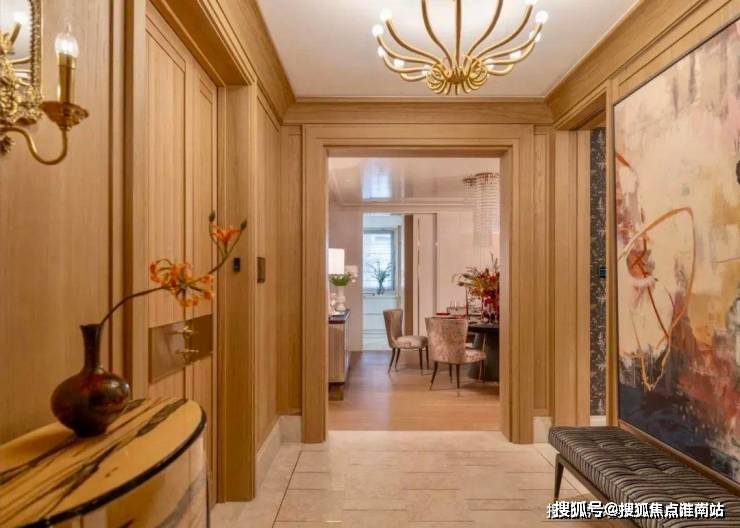 硬装上以木饰面和米色石材做结合,物料原始肌理感,表达经历时间后的沧桑痕迹。大理石地面镶嵌精致金属条,保留材质的原始感,木饰面配柔和灯光,调和出安宁澄澈的归家氛围。