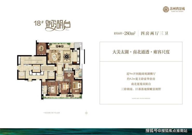 主力户型为约280-390㎡苏州湾绝版湖景平墅,入住人群均为高净值人群,户型由从业40年经验,15次国际大奖国际大师梁志天设计,户内层高3.45米,超大开阔客厅/套房,南北动静分离,洄游客厅+餐厨互动,双阳台最大化观湖大横厅,270度全景落地窗让湖景和城市景观如画卷。