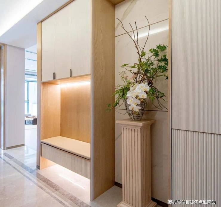 自入户玄关起始,淡雅的岩板背景结合温润的木色线条,奠定了归家的基调。