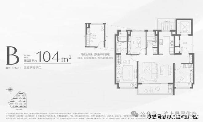 104㎡的户型,采用了大横厅+270°转角窗设计,南向阔景阳台面宽约5.3米,这样的尺度,在100平出头的面积段极其罕见。另一个南向客卧不管是当成老人房还是客房,都与另外两房做了物理分割,保证了最大程度的舒适度和私密性。