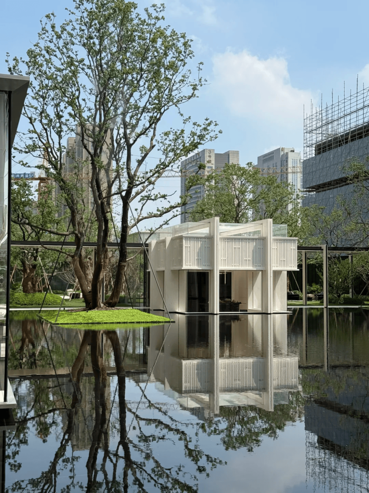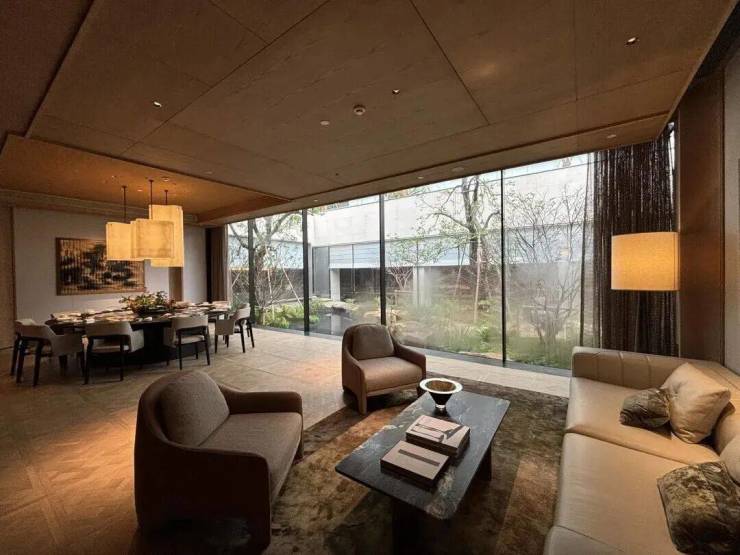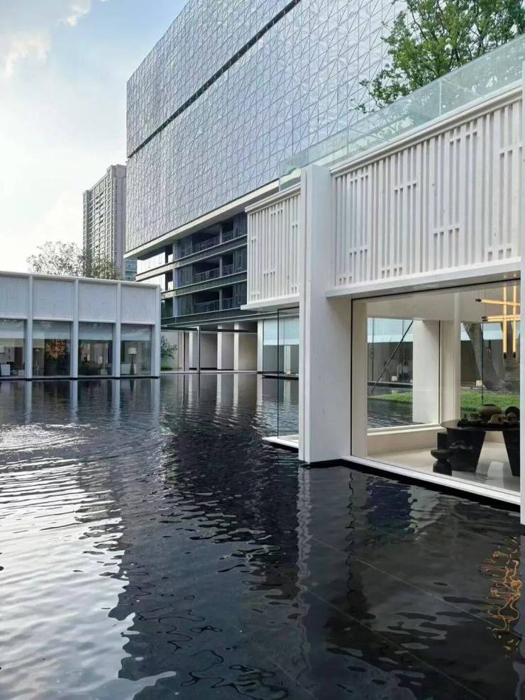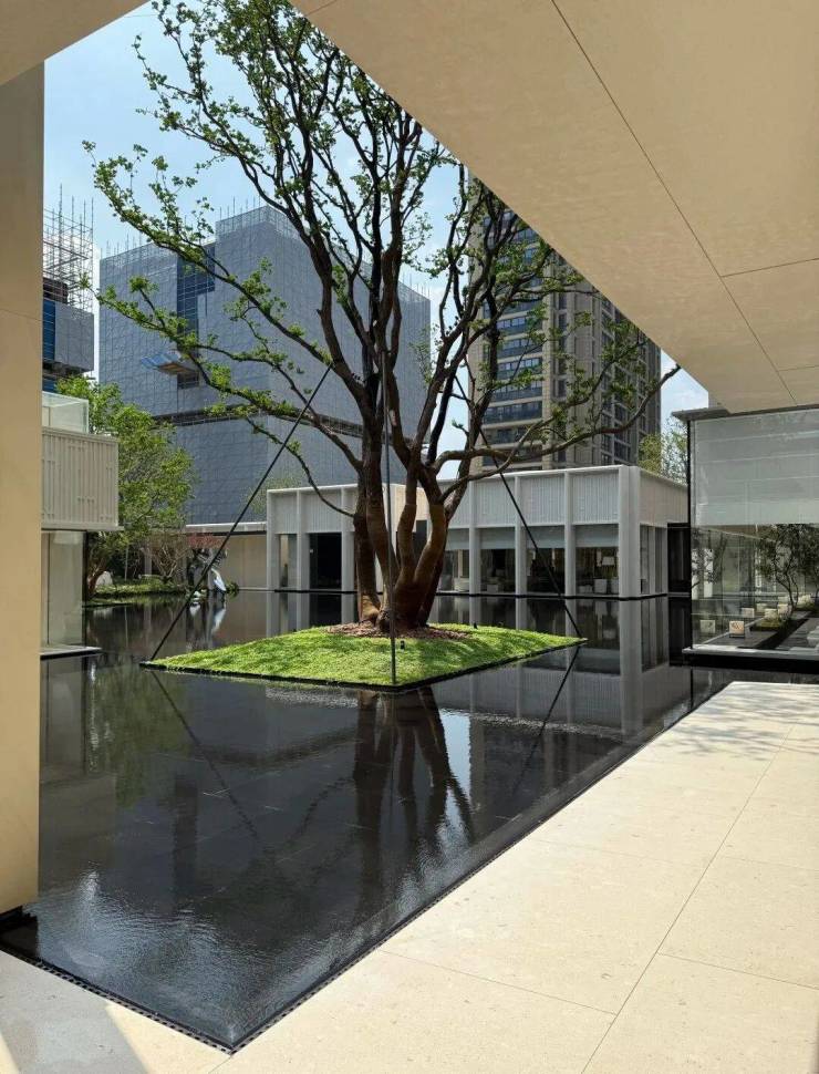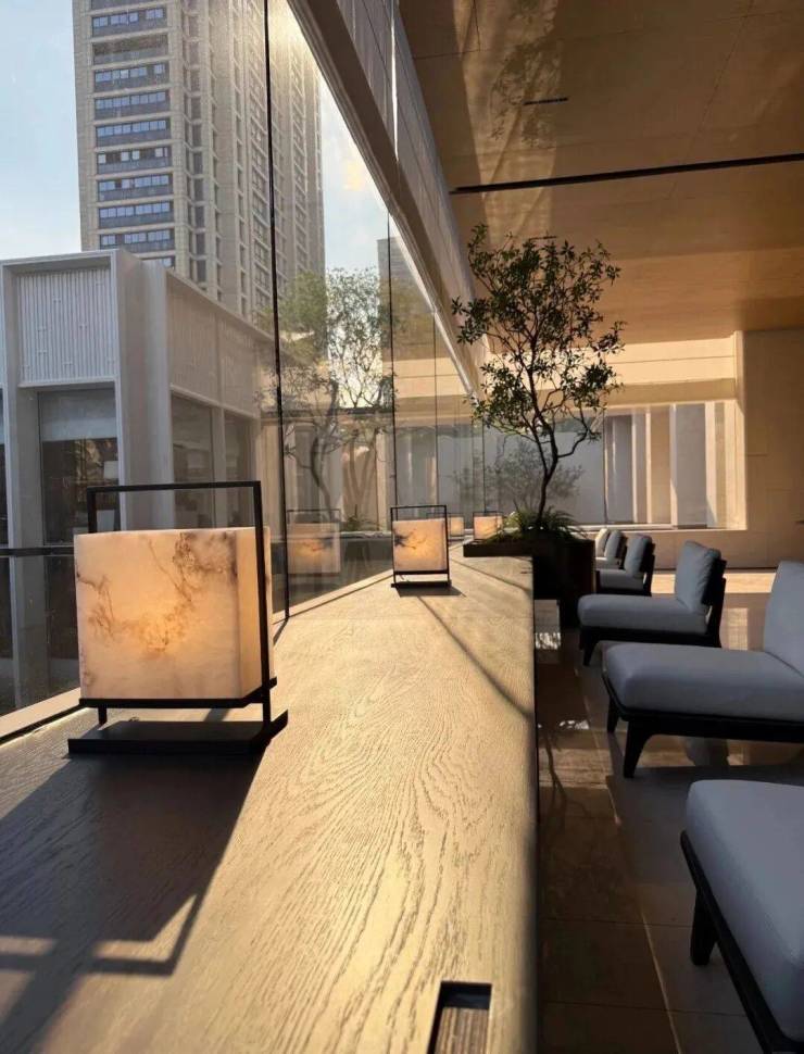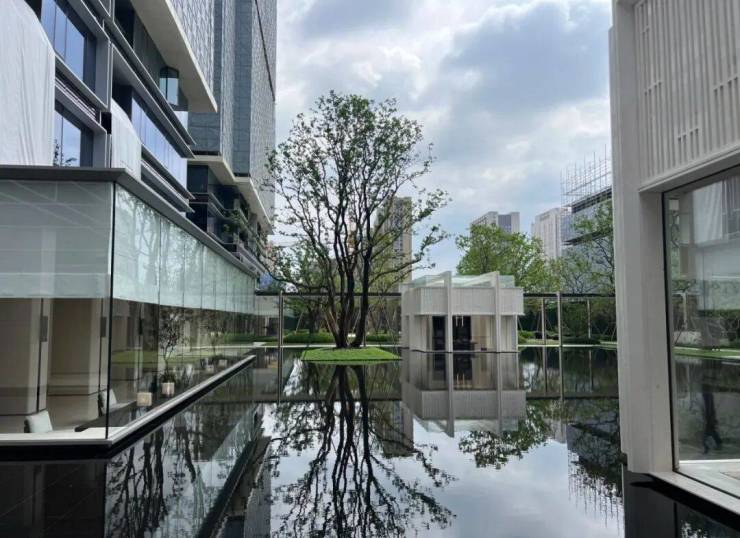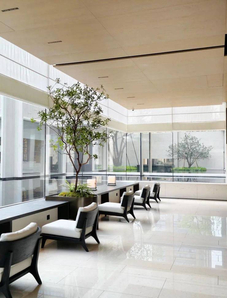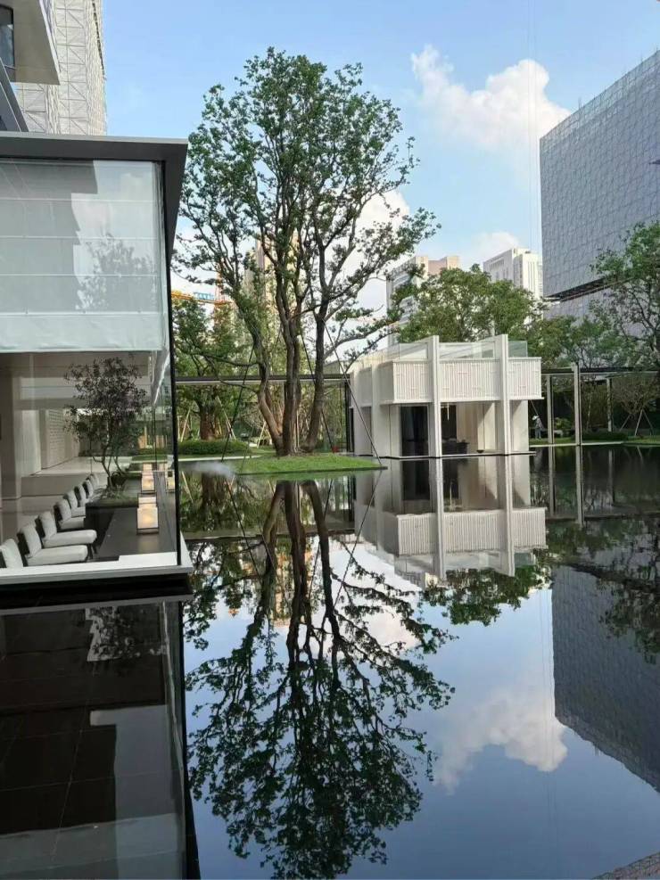 园林设计上则更偏酒店化,以希腊安缦卓熠为灵感,整个核心区园区以约900方的无界中央水景为主体。穿过大门后,约900㎡的无边界水景豁然眼前,建筑、回廊与树丛仿佛凌波而立。正如“美人在骨不在皮”,无需繁复修饰,大尺度空间、开阔水院与大面积玻璃自成画布,任自然光挥洒,这才是内蕴的性感。最是没的是在11号楼架空层的邻里中心——窗沿与水院浑然一体,桌案几乎与水面持平,微风拂过,涟漪便从眼前漾开。庭院里的丛生乌桕,不事雕琢,保留原生枝条的疏朗与错落,尽显自然之美。