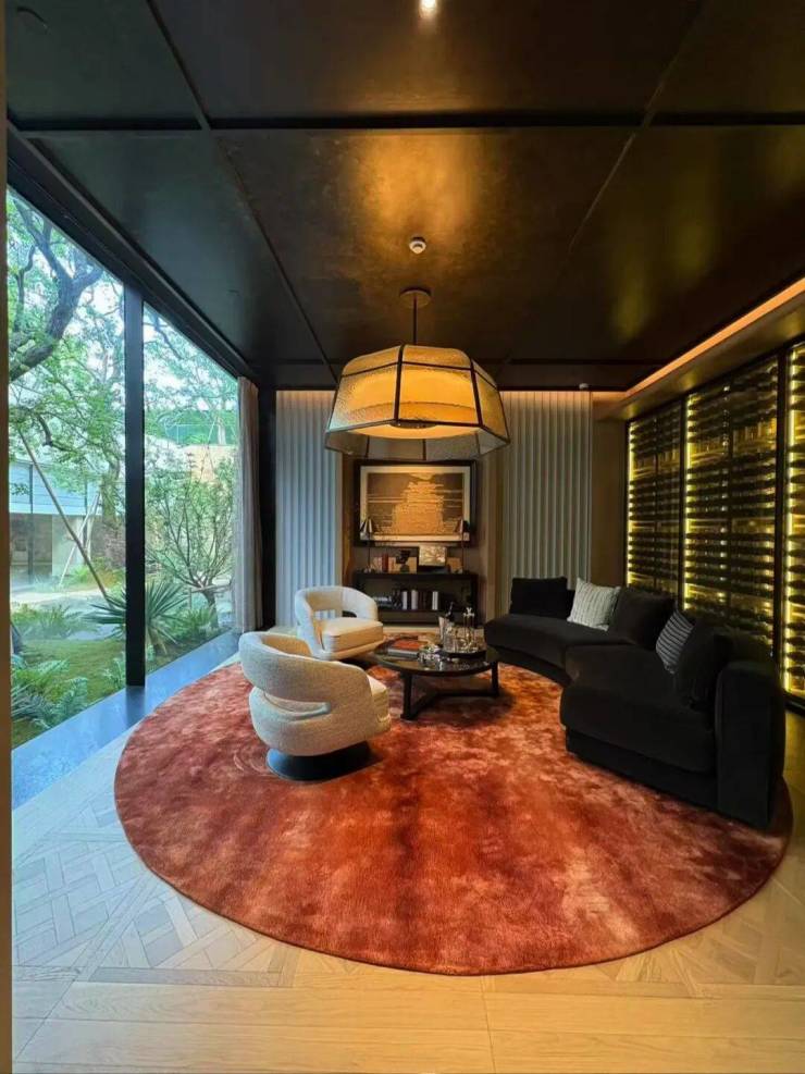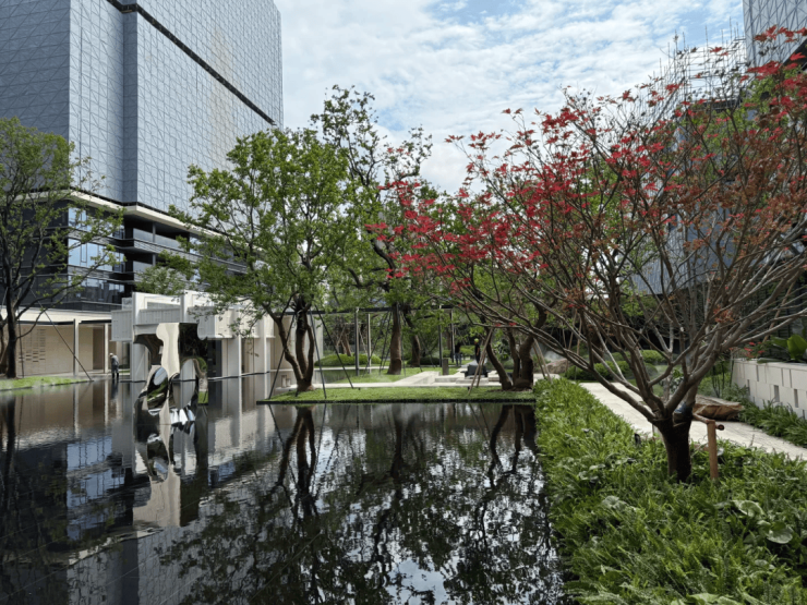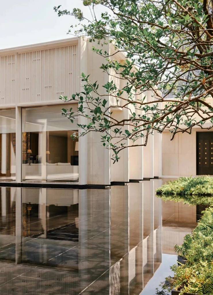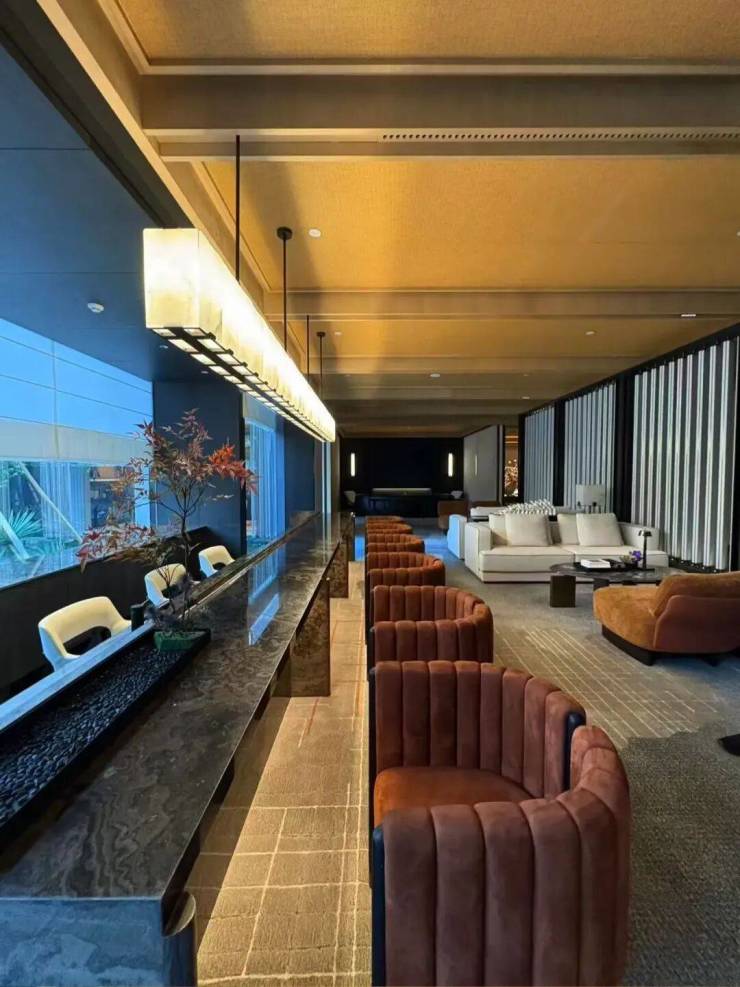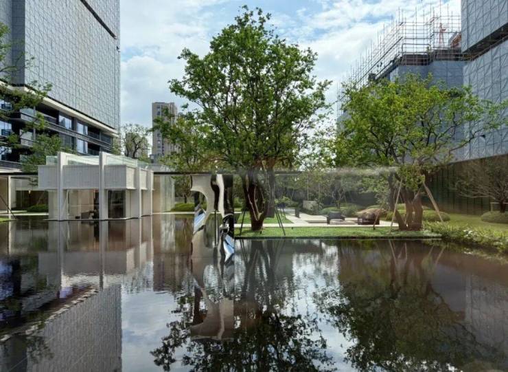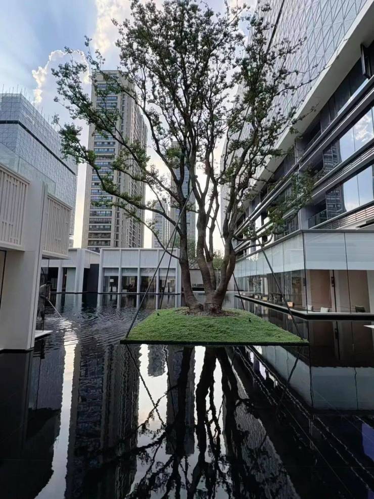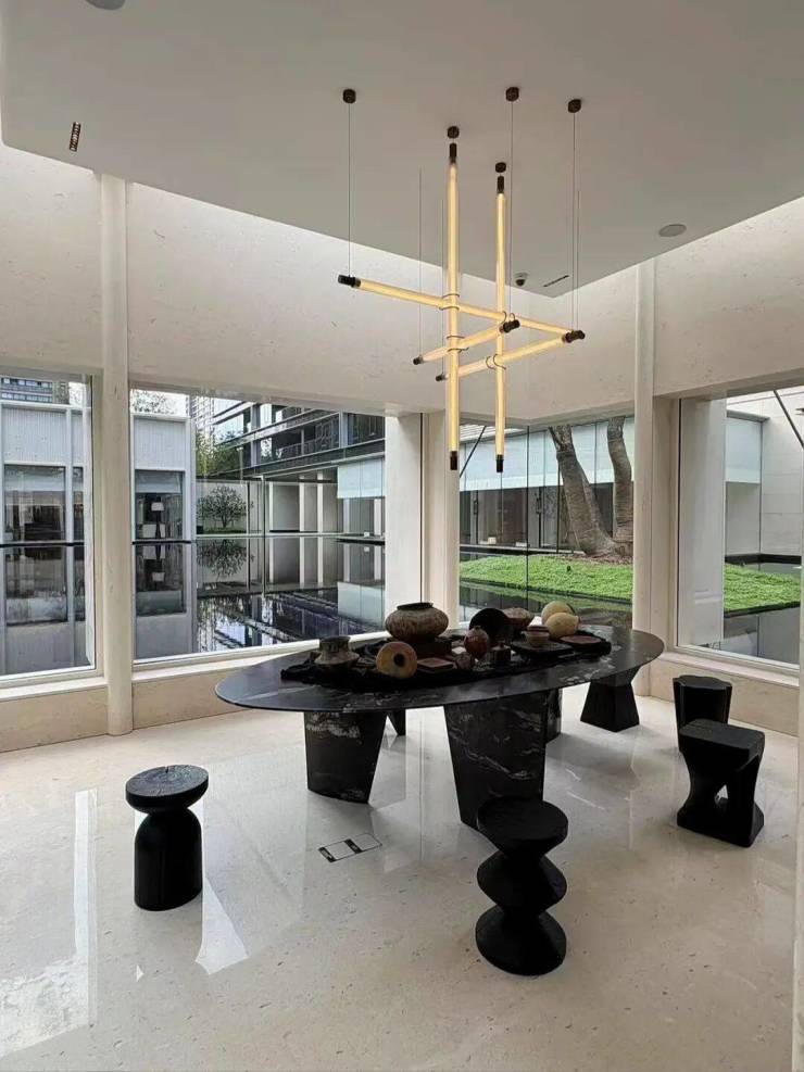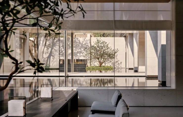 园林设计上则更偏酒店化,以希腊安缦卓熠为灵感,整个核心区园区以约900方的无界中央水景为主体。穿过大门后,约900㎡的无边界水景豁然眼前,建筑、回廊与树丛仿佛凌波而立。正如“美人在骨不在皮”,无需繁复修饰,大尺度空间、开阔水院与大面积玻璃自成画布,任自然光挥洒,这才是内蕴的性感。最是没的是在11号楼架空层的邻里中心——窗沿与水院浑然一体,桌案几乎与水面持平,微风拂过,涟漪便从眼前漾开。庭院里的丛生乌桕,不事雕琢,保留原生枝条的疏朗与错落,尽显自然之美。