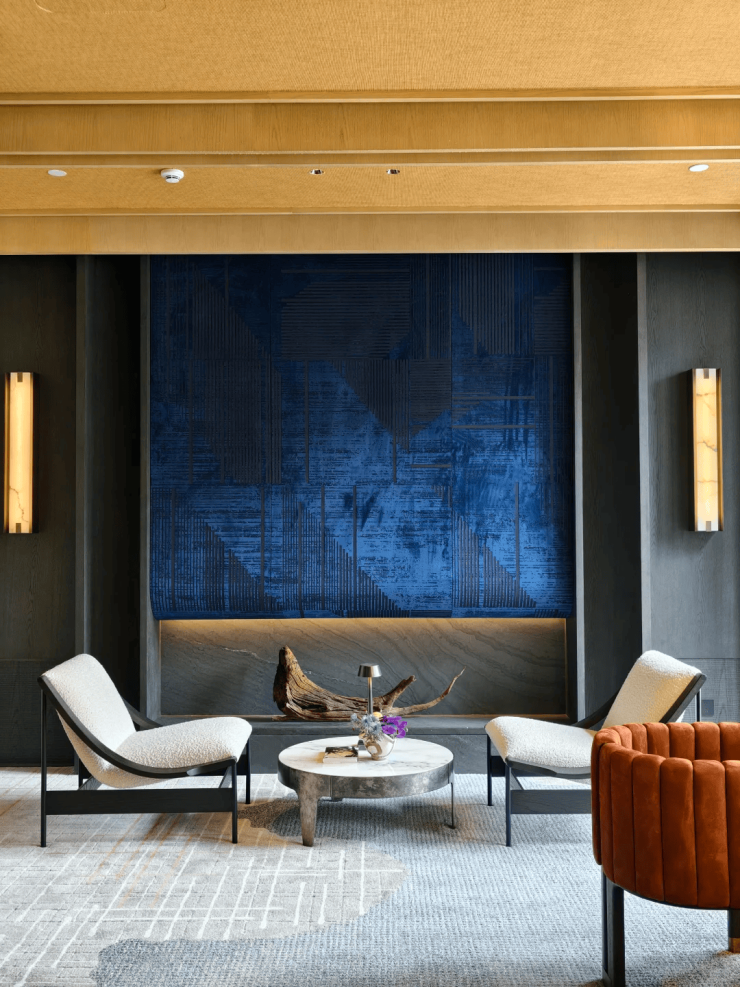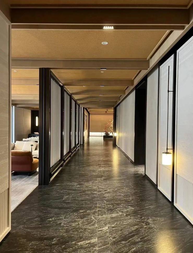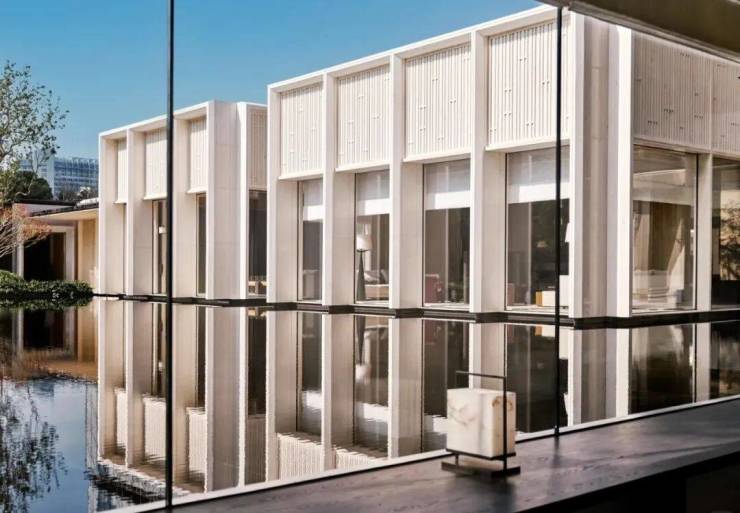 安璞的建筑立面,同样以其卓越的审美理念惊艳亮相,高层外立面以中式对称美学为基底,横向延展的铝材线条与大面积玻璃,赋予楼宇轻盈飘逸的视觉感受,实则坚固稳固,彰显空间容量而非体积感。南立面尤为惊艳,石材的厚重、玻璃的通透、均釉陶砖的温润,三种材质刚柔并济,在0.618黄金比例的精准统摄下,交织出极具艺术张力的奢华气韵。铝板、陶砖与石材的精妙结合,不仅保留了现代线条的轻盈,更通过陶材的温润光泽和石材的沉稳质感,营造出富有层次的艺术魅力。