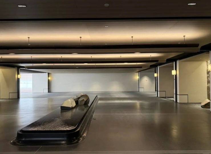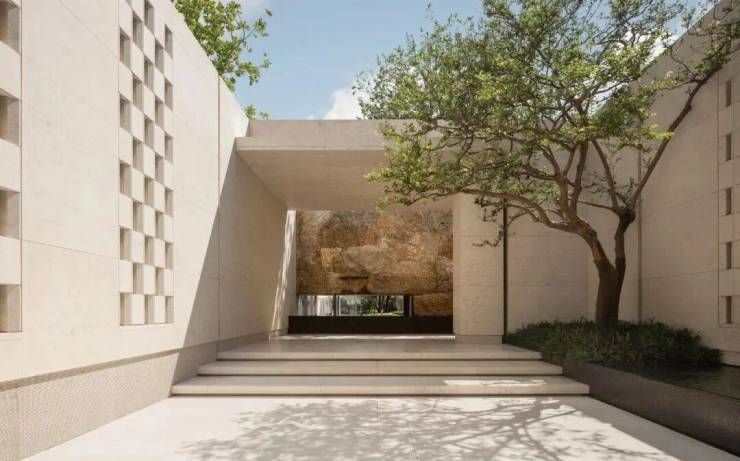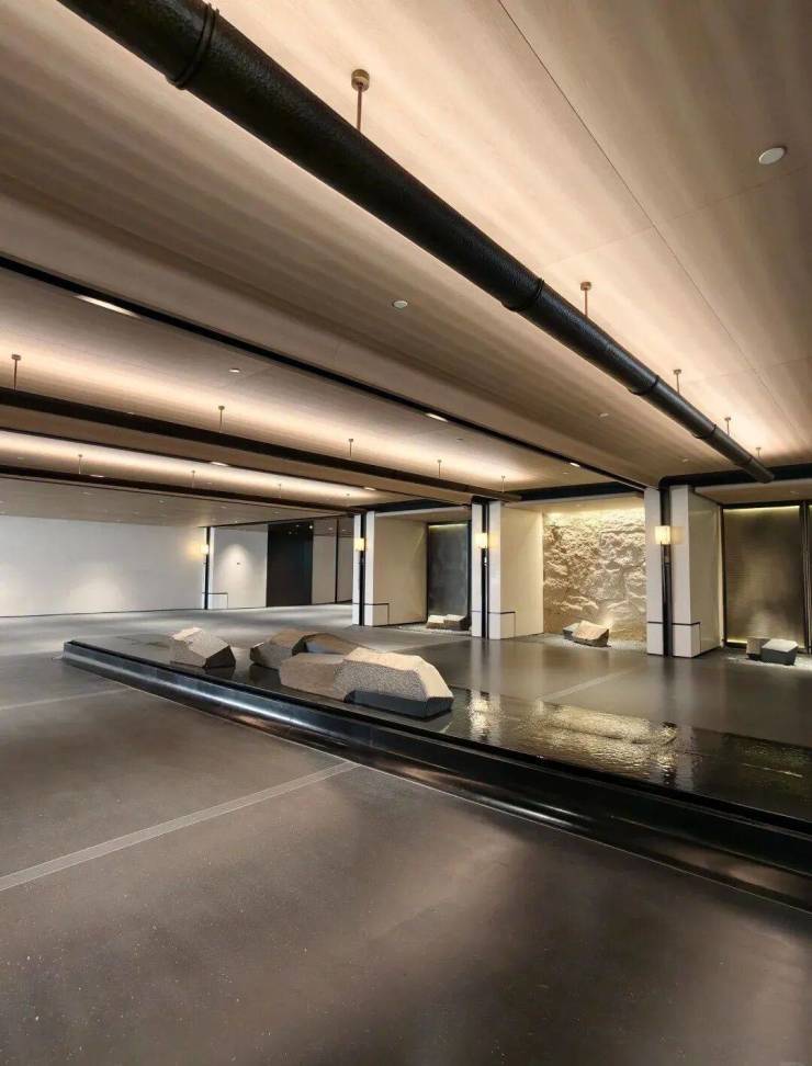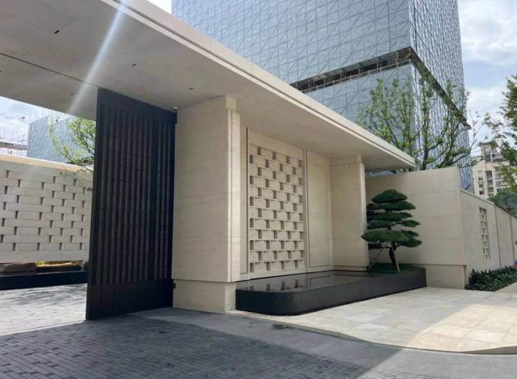 约36米长的主入口,与这其他项目流行的巍峨豪阔、金碧辉煌已截然不同,黑白原石的碰撞,没有五颜六色的炫石,主打一个高级黑白灰,从社区主入口便能领略这份高级感。它并未将大门设在主干道,而是巧妙地选择在西侧次路,营造出一种归隐都市的谧静氛围。以维纳多石材为主体的双门设计,左侧是人行入口,右侧为车行入口,秩序井然,人行车行各司其侧,搭配古朴铜门,尽显宏伟与艺术格调。太行金老石皮打造的景墙,借框景手法呈现流水山石的空灵意境。