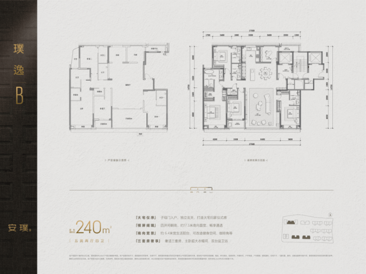 240㎡户型为5房三套房,四开间朝南,面宽达17米,客厅与卧室采光效果极佳,居住舒适度显著提升。