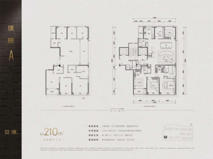 210㎡户型为5房双套房设计,三面采光保障室内通透,适配三代同堂的基础居住需求,家庭成员各享独立空间,互不干扰。