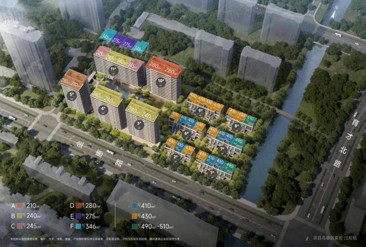 项目容积率仅1.8,打造5栋12-16层高层与6栋4层排屋,总户数180户,成就稀有的低密社区。高层建筑面积约210-280㎡,均为五房设计,顶跃户型建筑面积约275-346㎡;排屋建筑面积约410-510㎡,地上4层,地下层高约6.4米。无论是空间尺度还是功能定位,均对标并超越奥体、钱江新城的一线高端产品。