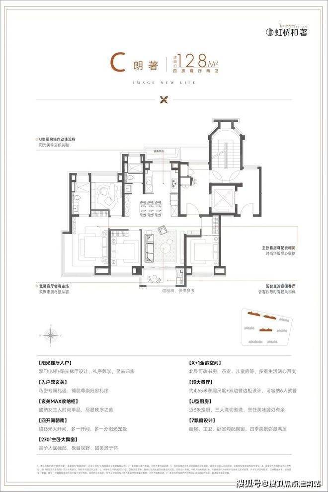 建面约128㎡4房稀缺改善户型,灵活性强过去很长一段时间,由于土地端7090政策限制,新房产品绝大部分以百平米左右刚需产品为主,而保利虹桥和著此次将推出建面约128㎡稀缺舒适四房,本身就是一次难得的改善机遇,更何况该户型设计非常亮眼,四开间朝南设计,尽可能将更多阳光引入室内,主卧270度飘窗+南北通透大套房设计,同级别户型中十分罕见,充分满足舒适度和身份感。
