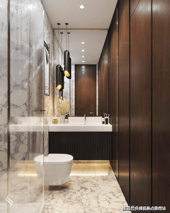男女分开的浴室,配有黄铜配件,高级瓷器和天然木材。