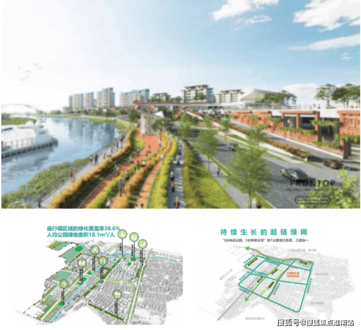 庙行镇的宜居基因,根植于 “水绿共生”的规划哲学。 以 ”蕰藻浜,东茭泾“T字滨水公共空间为骨架,以”四座公园,千亩绿地”为肌理,着力构建无界共融的“一T双环”公园城市格局。
