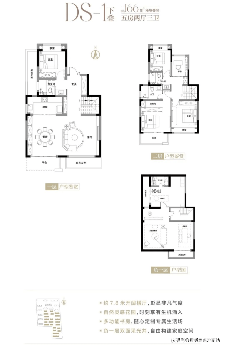 关注户型设计,约166平五房下叠,一层为餐客厅搭配老人房,二层为三卧室+书房,功能区分错落有序;