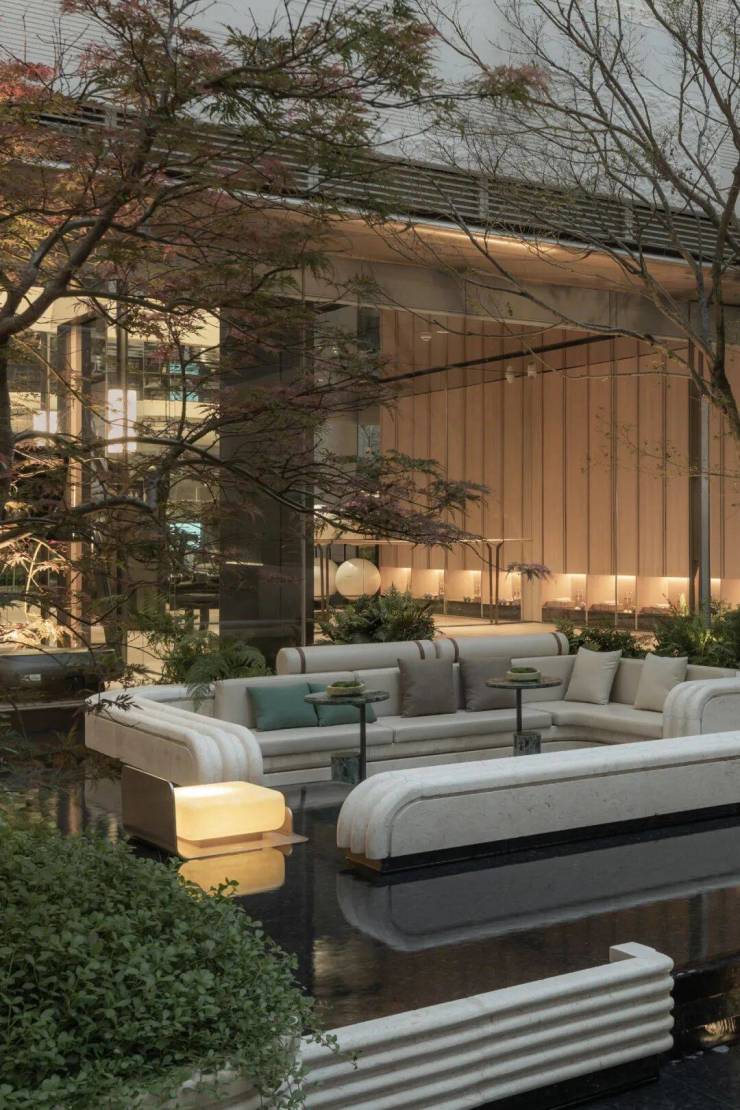以钱塘江和运河的粼粼波光为设计灵感、全长约46米的门头,带来的杭州豪宅美学的创新。与市面上绝大多数门头喜欢的豪气不同,翠隐江粼轩选择了用流动的质感去呈现静谧的隐奢,如水在流动,如丝绸飘拂,像杭州这座城市骨子里的诗意与优雅。