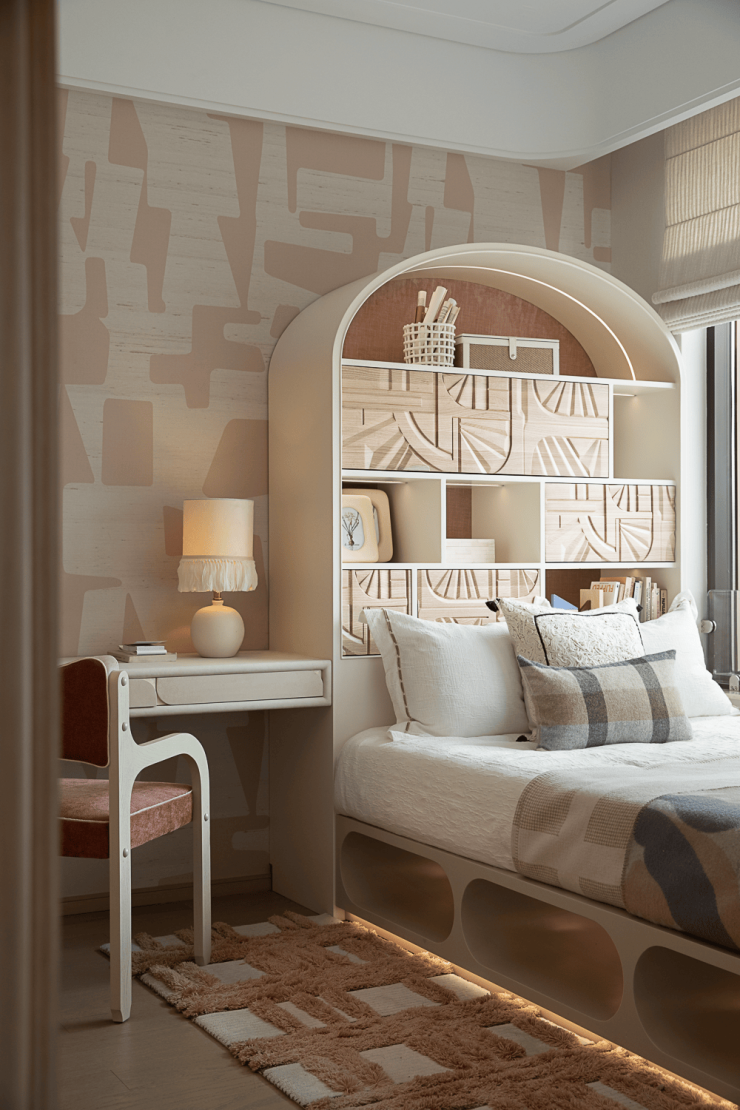 女孩房以粉白色为调,营造童趣唯美的成长天地。床体与收纳柜一体设计,弧形顶柜兼具收纳与装饰功能。飘窗,成为安顿身心的精神角落。展卷小憩或凭窗静思,皆可于熟悉的日常中,抵达诗意栖居的真意。