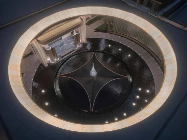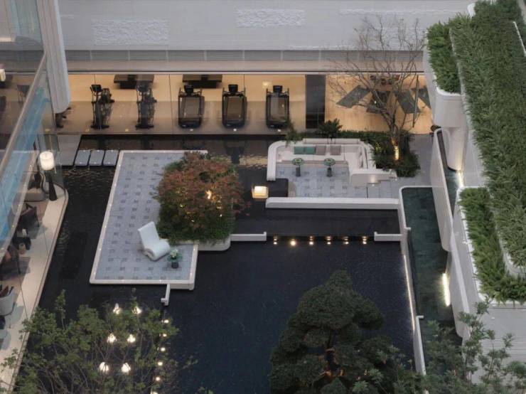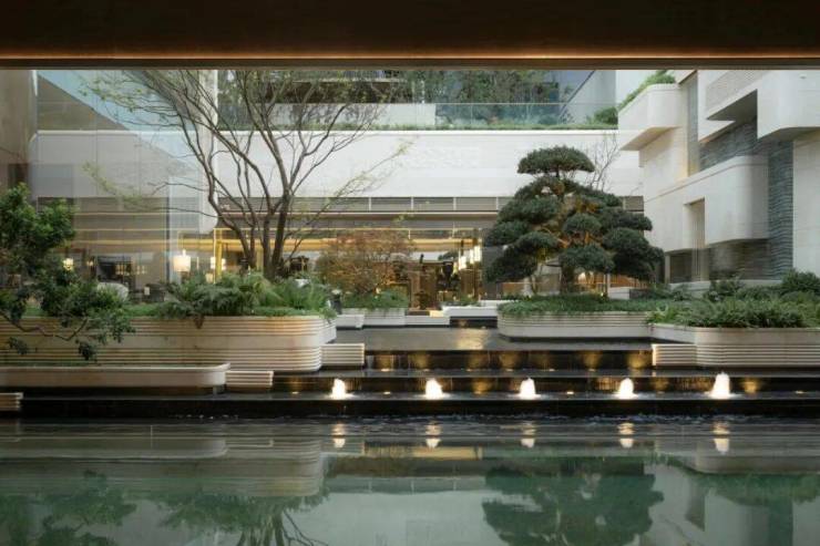 中央水景仿佛运河的一滴水直接滴入了社区,石材打造的基座像是溅起的涟漪,会把廊柱的影子与运河的波光揉碎,又慢慢复原。两侧镜水面如一块巨大的翡翠,倒映着天光云影与回廊倩影,让时光都变得缓慢。