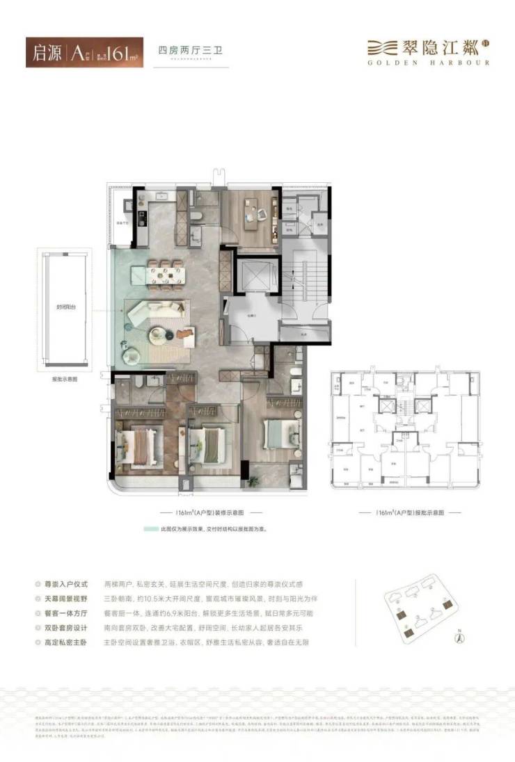 翠隐江粼轩的户型为建面约161-185-230㎡的纯粹大户型,起步就是四房两厅双套房的纯粹改善户型,是可以满足大多数家庭一步到位的终极改善之选。特别是在市中心豪宅起步面积动辄200㎡甚至更大的背景之下,翠隐江粼轩建面约161㎡的主力户型,甚至稀缺到成为市中心千万总价的唯一之选。
