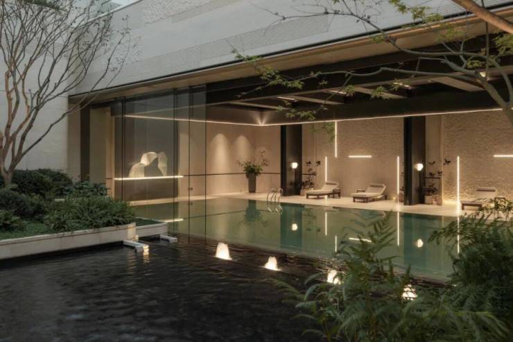 泳池空间内外,室内室外水面标高一体化,将室内恒温泳池的视线向室外延伸,不仅让人感受水流的温柔,泳池边的叠水台,水流顺着台阶缓缓流淌,倒映着庭院的林影,透出另一种松弛。
