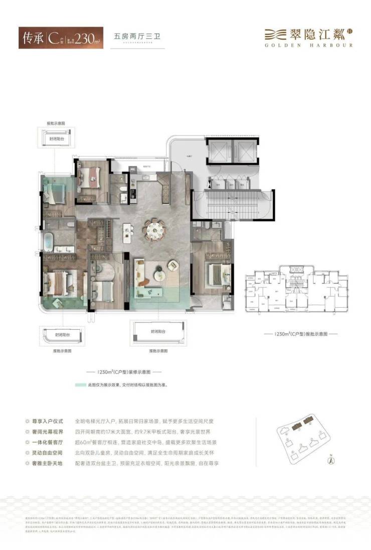 翠隐江粼不仅套内面积的使用率已经达到了约87%-90%,而且翠隐江粼的建面约185方户型和建面约230方户型都是带转角电梯明厅的两梯两户设计,目前在售少量160㎡、主力户型185-230㎡,均价6万,单价5.1万起!总价900-1400万!