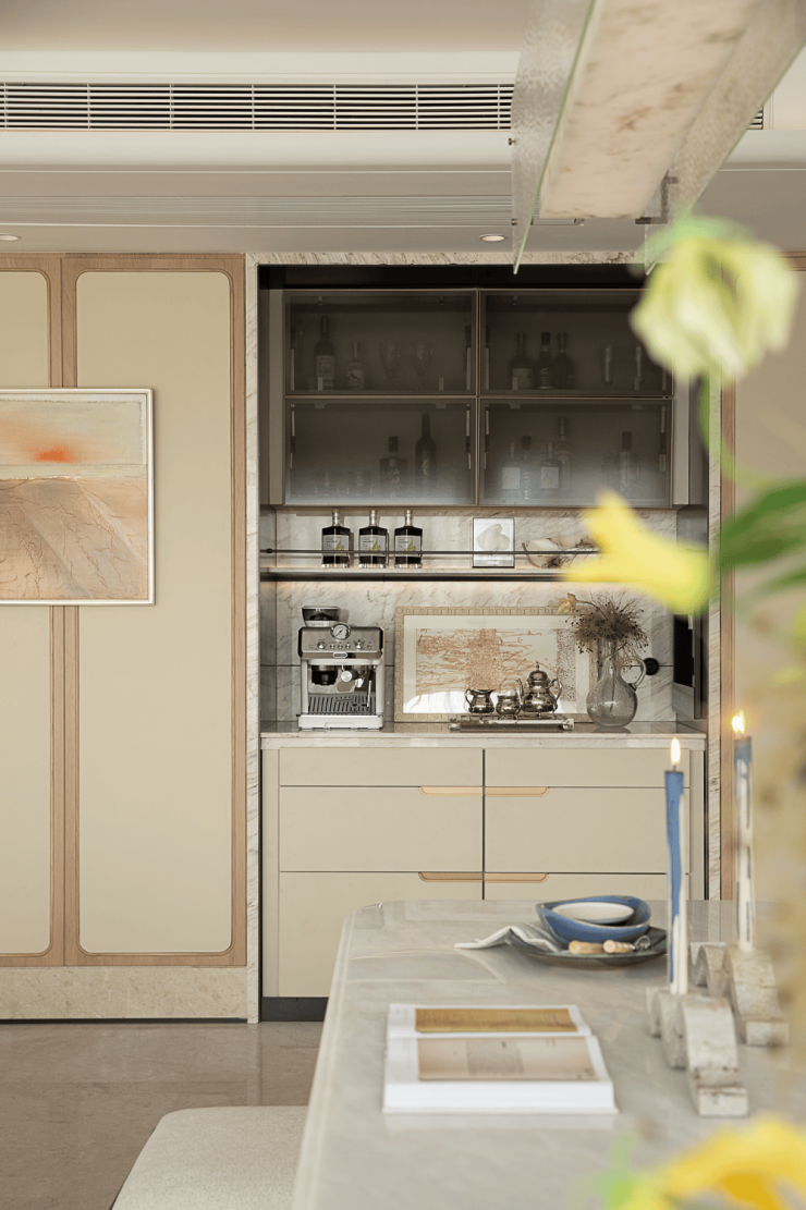 餐厅中,云石与琉璃共舞的吊灯,晕染出温润光域。几何烛台与玻璃花器于低语呼应,共呈舒适与精致并存的用餐场景。餐边柜静立于侧,咖啡的氤氲与酒香交织,将寻常三餐,升华为仪式感的盛宴。