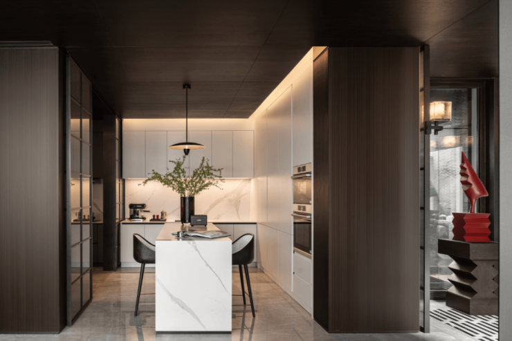深浅分色、平直简练的界面,透露出现代风格的基调。舒朗开阔的中西双厨,中厨贴合内庭院,是看得见风景的厨房。