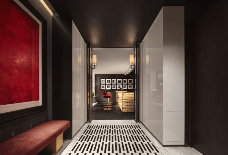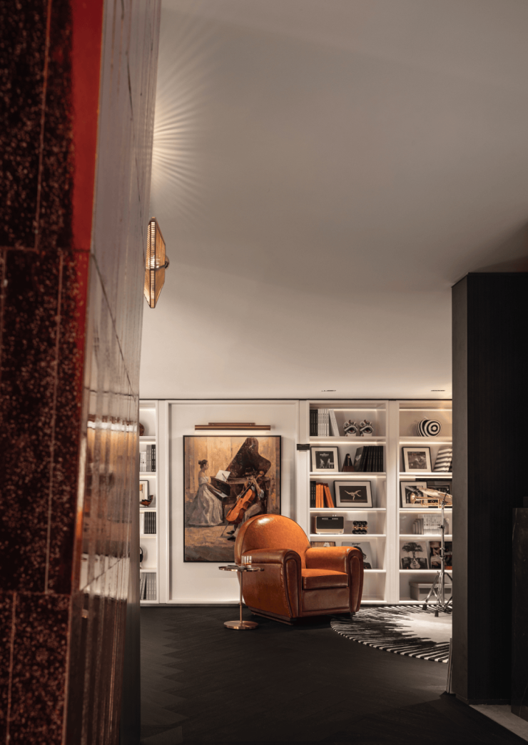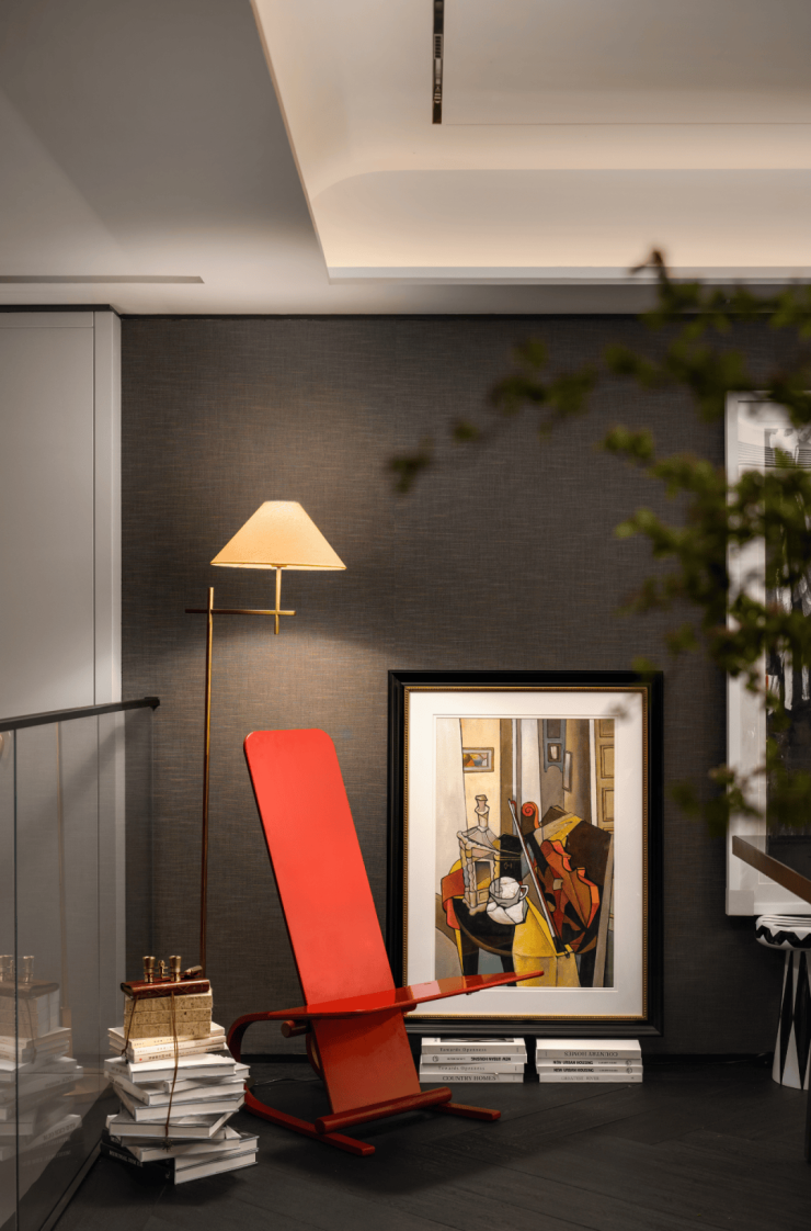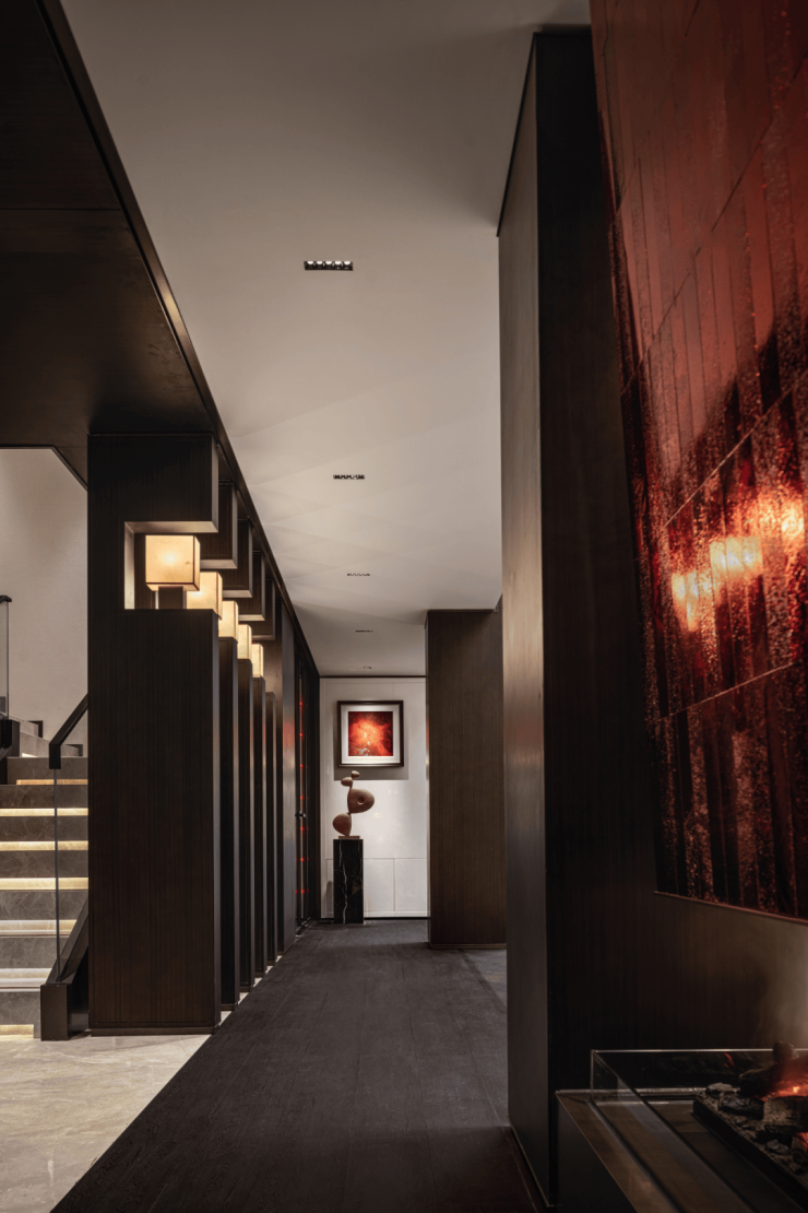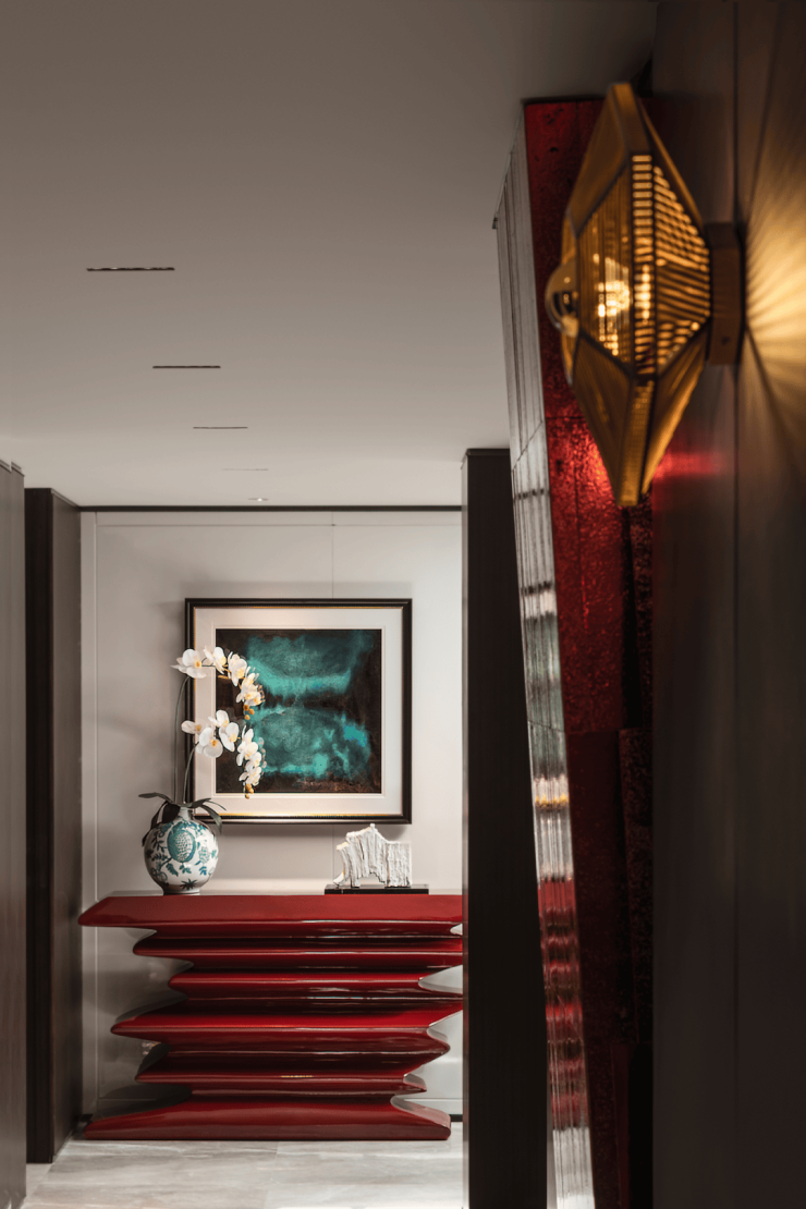 地下入户玄关,是合作艺术家归田创造的“红色的梦境”油画作品。红色是整个室内的主题色之一,这幅量身定制的艺术品,是设计主题的升华表达。