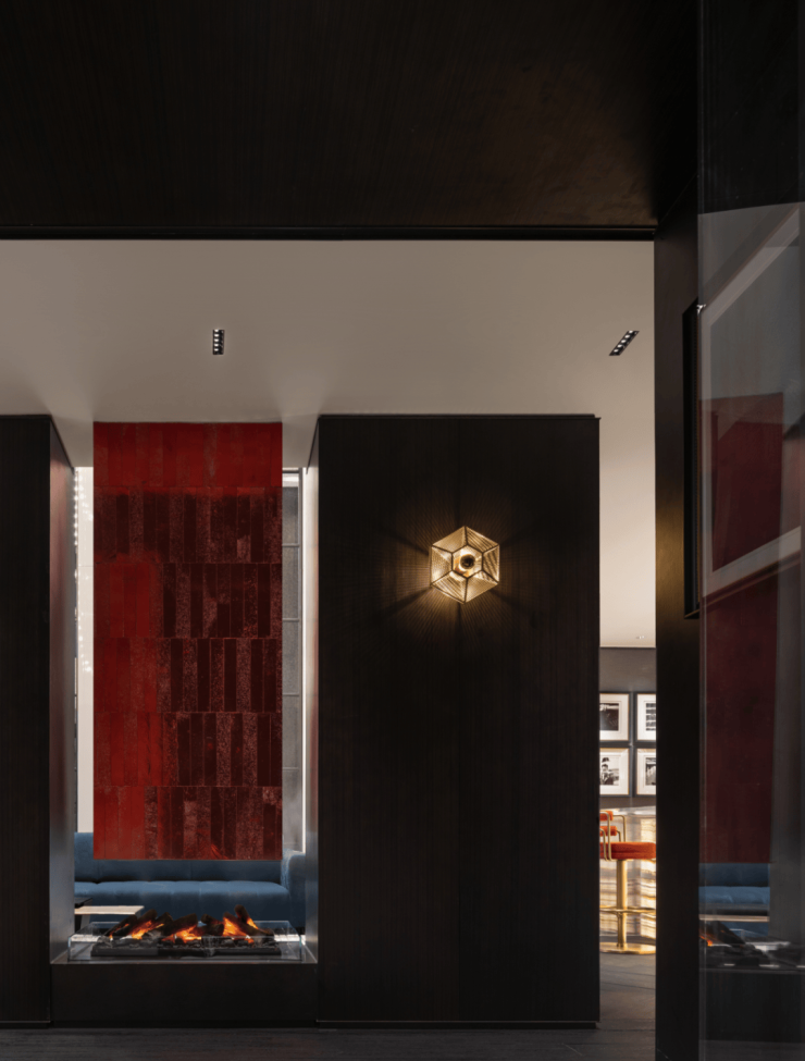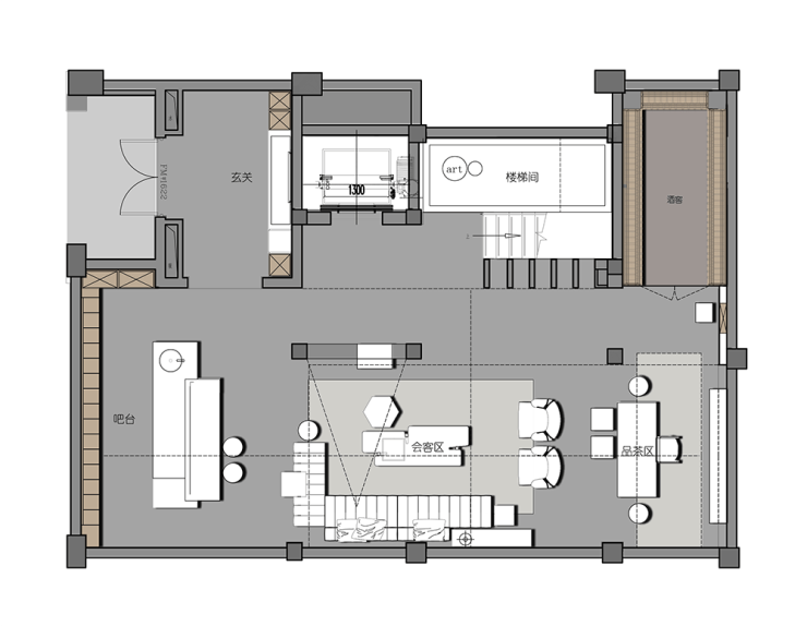 地下室存在两根醒目的结构柱,为了不影响整体感与美观,设计经多次推敲后,在两个柱子之间设计了一个造型壁炉,壁炉的造型及饰面都紧贴空间的整体风格。