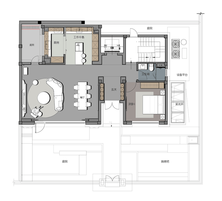 设计重视开放与私密的联动,梳理出最恰当的空间逻辑关系,重视与室外的交互感,贴合外部美好的自然环境,充分发挥全景采光及庭院的景观优势。