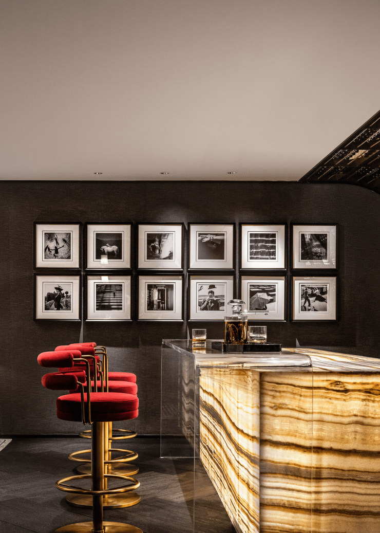 水吧红色高脚吧台椅,分外吸引眼球的透光石吧台,美轮美奂,带给空间强烈的气氛渲染。