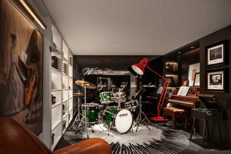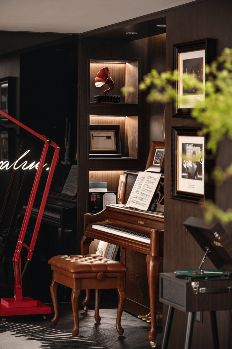 夹层,来自ACROSS HOUSE中古油蜡皮沙发,与钢琴、架子鼓、胶片、音响、吉他……构建一个沉浸的音乐世界。