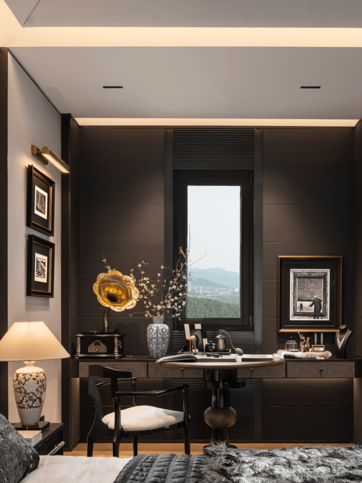 利用临窗区设计了一个集梳妆台及阅读为一体的功能区,考究的装饰及精致的家具,色彩组合,体现出不俗的审美品位。