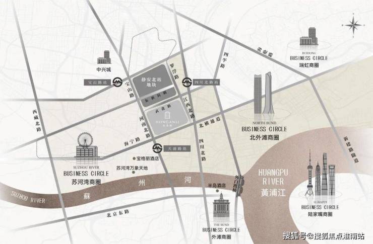 仅从图上看,该地块直线距苏州河约1公里,直线距外滩约1.4公里,直线距北外滩约1.7公里,直线距3/4号线宝山路站约300米,直线距10号线四川北路站约560米,区位优势明显。