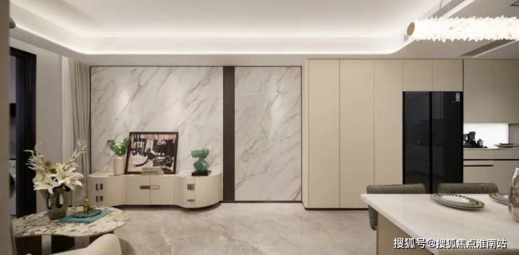 另外,入户玄关处的开放格背板采用 罕见的白冰玉石材利用人造光源,通过石材的反射和折射,纹理清晰分明。