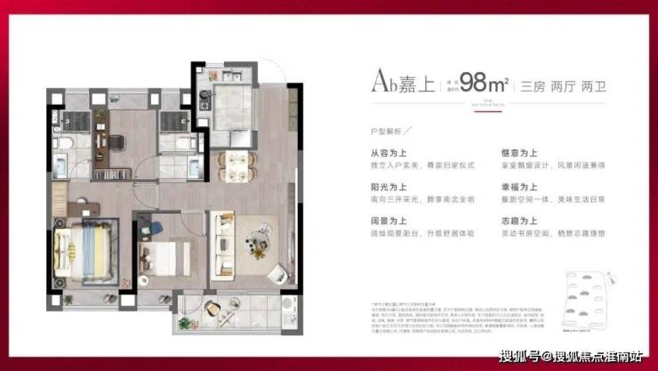 建面约98㎡3房2厅2卫户型,分别是边套、中间套,满足不同人群的居住需求。