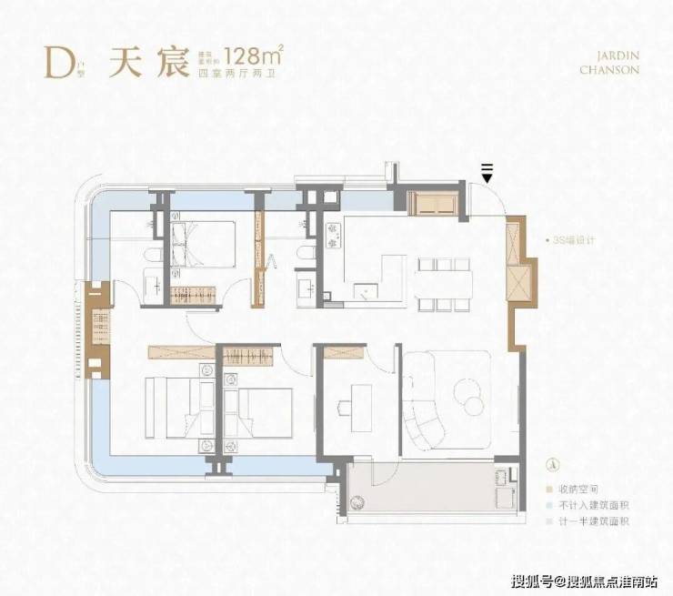 约128-139㎡四房:7米横厅+双主卧全景飘窗,部分户型配备3S墙收纳系统,实用性与舒适性兼具 。