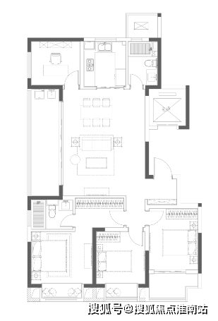 6-1#和6-2#的西边单元的中间户,为建筑面积114平的户型,房屋套型为3房2厅2卫,3开间朝南,整体户型较为方正,南北通透。客厅的阳台和次卧阳台打通,主卧为套房设计,带有独立的衣帽间和卫生间,且主卧有飘窗设计。