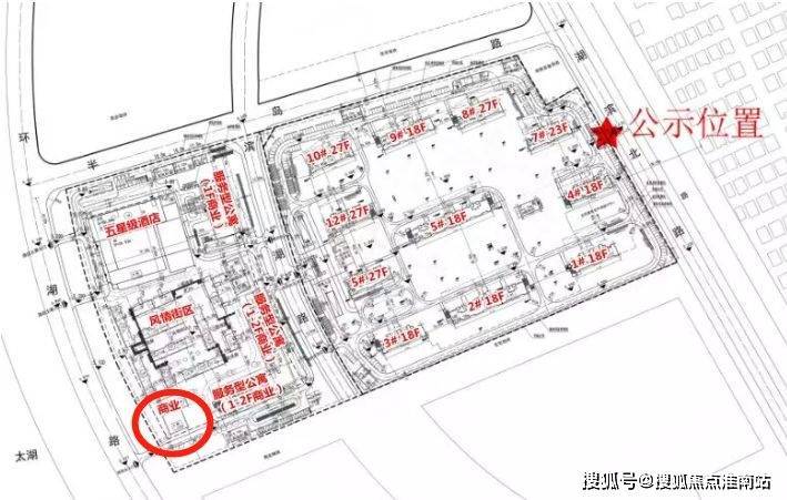 在滨湖路的西侧,规划的是商业部分。根据规划,有3栋6-9F的服务型公寓,还规划了约7200平活力街区和约9200㎡风情街区,以及1栋自持的五星级酒店,而该酒店内配置了计容建筑面积大于5000平的会议室。