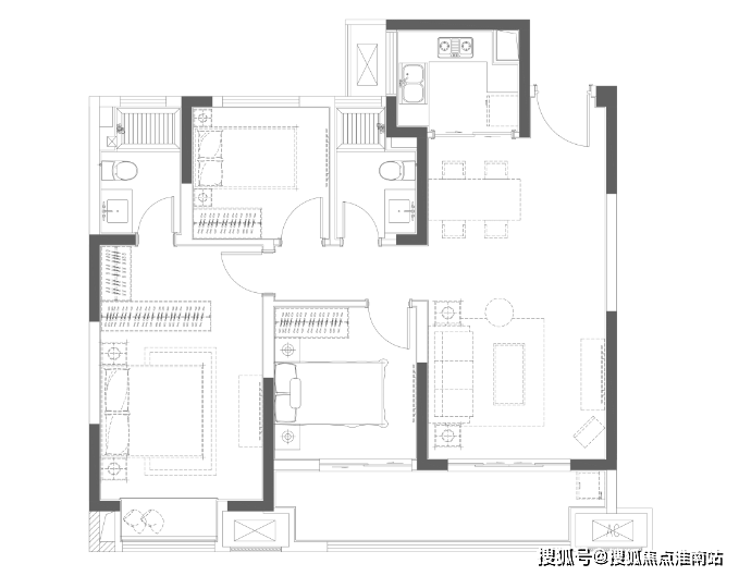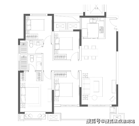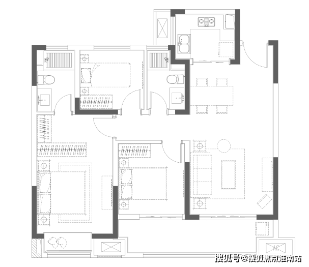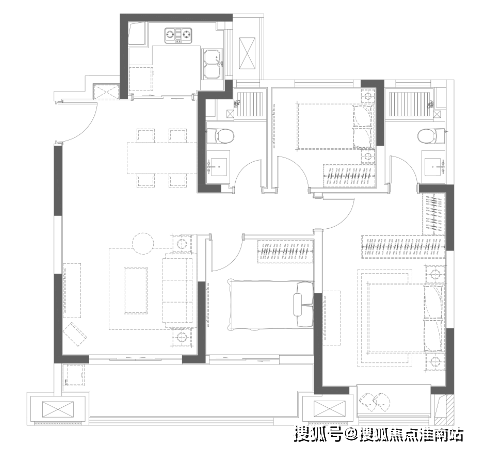 10#中间户,为建筑面积112平的户型,房屋套型为3房2厅2卫,3开间朝南,主卧为套房设计,带有独立的衣帽间和卫生间,且主卧有飘窗设计。