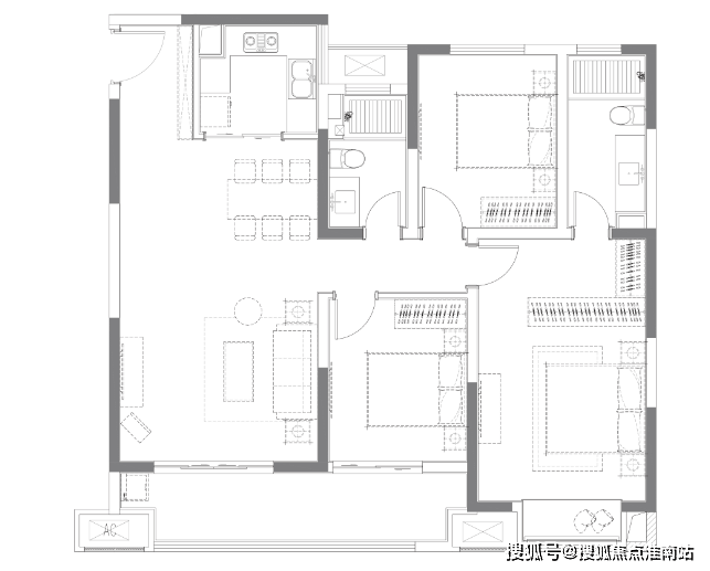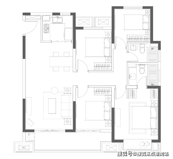 3#的东西边户,为建筑面积136平的户型,房屋套型为4房2厅2卫,3开间朝南,客厅的阳台和次卧阳台打通,主卧为套房设计,带有独立的衣帽间和卫生间,且主卧有飘窗设计。次卫和北向的一个卧室可在视觉上形成类套房的设计。