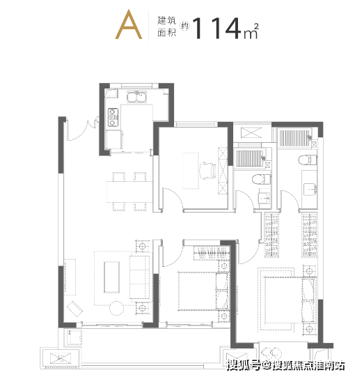 3#的中间户,为建筑面积114平的户型,房屋套型为3房2厅2卫,3开间朝南,整体户型较为方正,南北通透,基本没有浪费的空间。客厅的阳台和次卧阳台打通,主卧为套房设计,带有独立的衣帽间和卫生间,且主卧有飘窗设计。