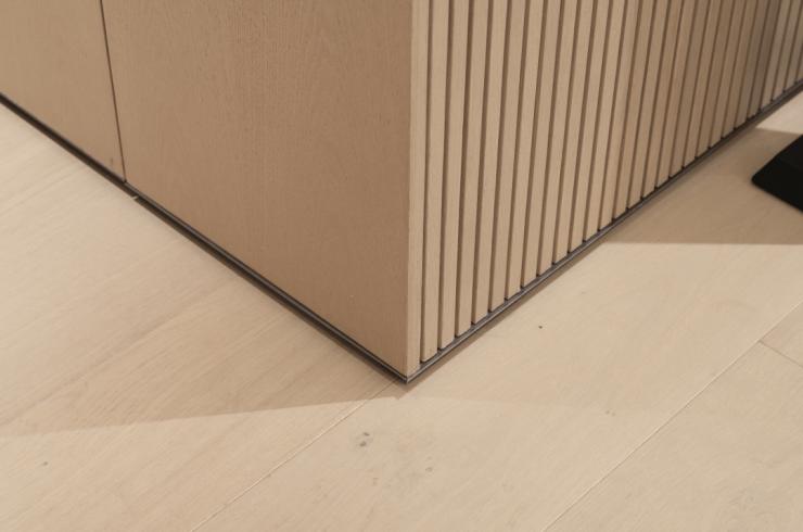 极简审美,从背景墙开始一路延展,无边框隐形门,以及简化的金属踢脚线,让立面保持完整如一。