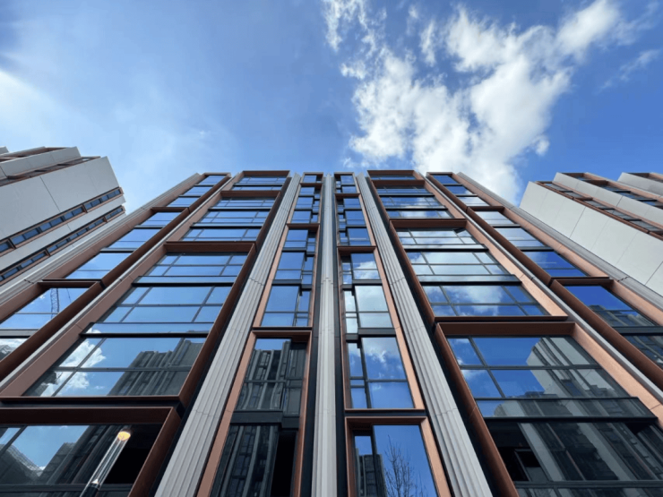 天安1号前期的住宅外立面选用铝板+石材,搭配大面积玻璃,颜值出众!