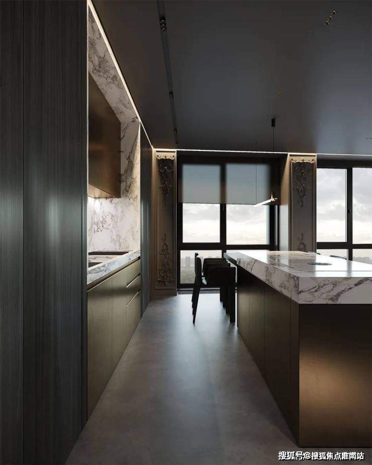 转入餐厨空间,柚木铺垫的橱柜系统,与电视柜相呼应,奠定了舒缓柔和的自然基调,岩板台面及金属饰面延伸至岛台、餐桌,纹理的交织,辅以高级灰的渲染,串联起温暖的生活记忆。