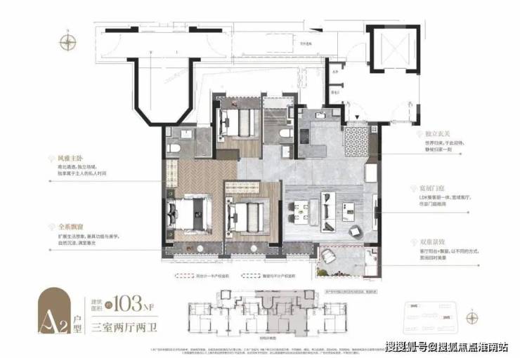 项目建面约103㎡3房同样是三开间+大横厅的布局,但尺度上更进一步。而且灵动空间更多,全屋飘窗+南向观景阳台,提升性价比的同时也增强户型对外的延展性。