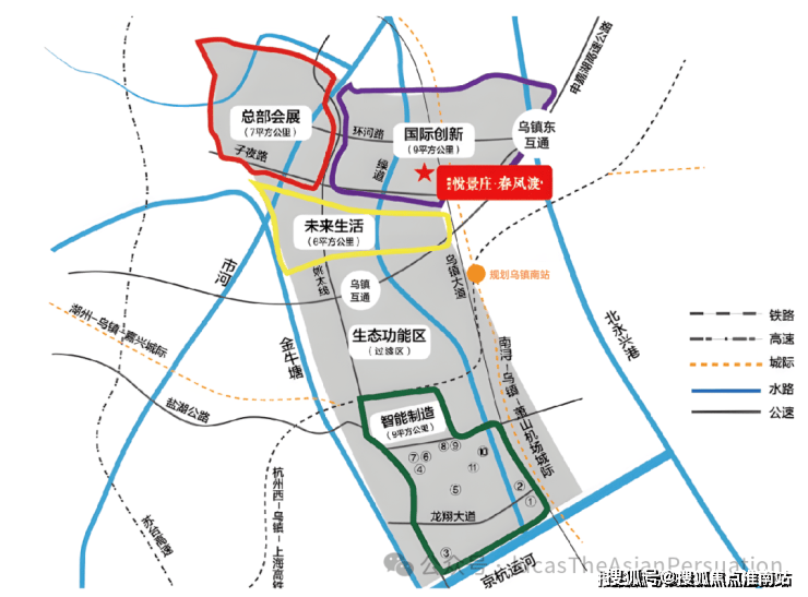 项目紧邻乌镇新客站及乌镇南站,随着南站设立,交通提速、板块崛起,未来将承接上千万游客和海量高新技术人才。