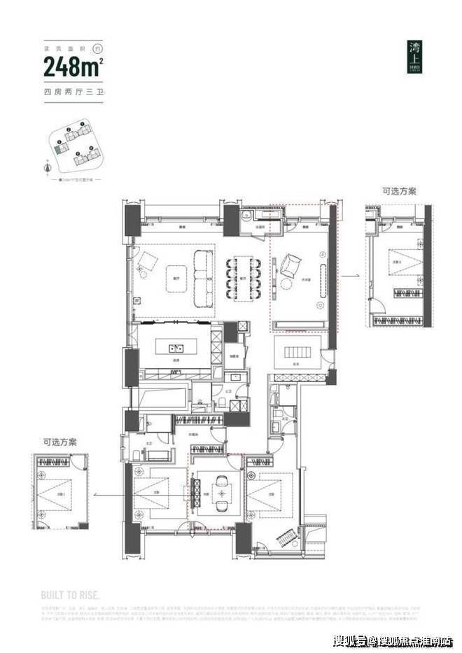 约138-198㎡大三房和定制化248㎡大四房,大师设计户型+国际品牌精装,可以根据家庭结构的变化,自行改造室内空间布局。