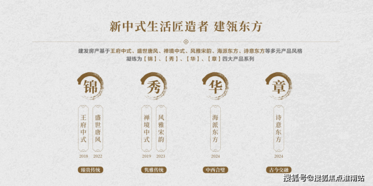 建发房产基于王府中式、盛世唐风、禅境中式、风雅宋韵、海派东方、诗意东方等多元产品风格,凝练为【锦】、【秀】、【华】、【章】四大产品系列。