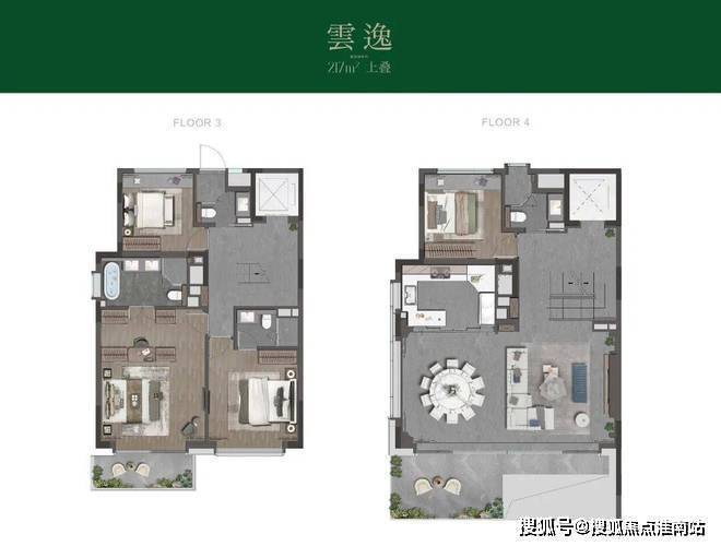 2层设置卧室空间,2个套房+1个类套房。主卧步入式衣帽间,双台盆加浴缸的设计,再加上一个观景阳台,奢阔尺度直逼250+㎡的大平层。